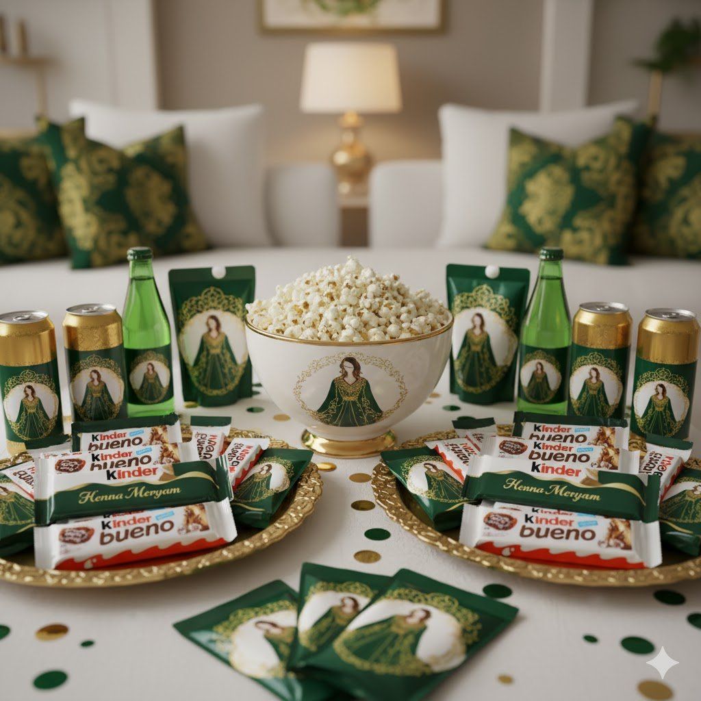 Apprends à créer une sweet table harmonieuse et personnalisée avec des emballages sur mesure : étiquettes de bouteilles, Capri Sun, Kinder Bueno, barres chocolatées et bien plus encore.